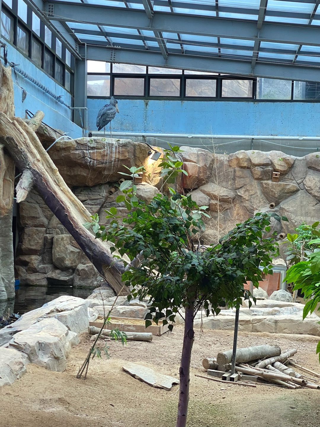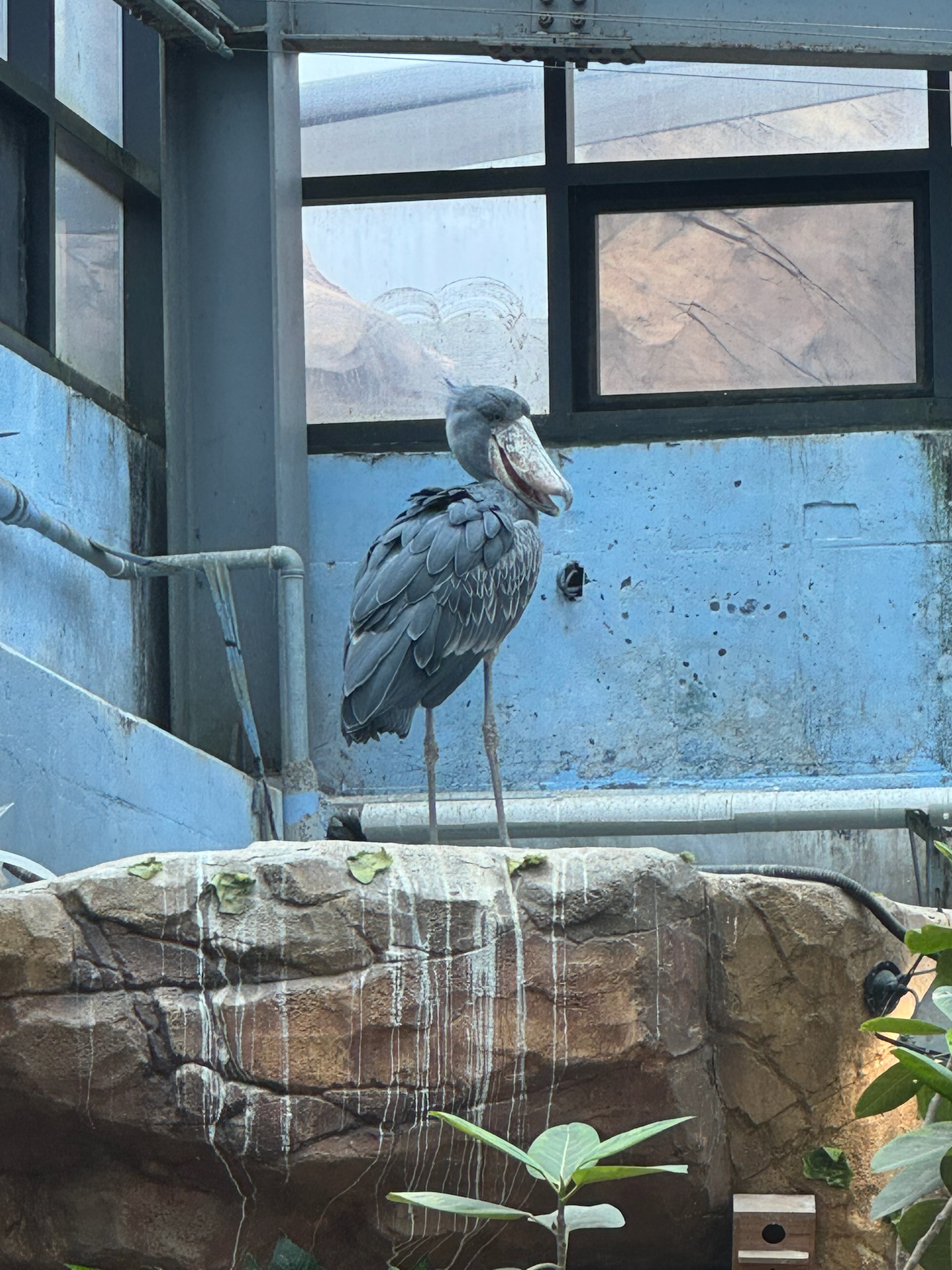 2층 조류관에서는 국내 유일하게 전시 중인 ‘슈빌’(넓적부리황새)을 만날 수 있습니다. 슈빌은 구두처럼 넓적한 부리가 특징인 대형 조류로, 아프리카에서 주로 서식하지만 국내에서는 오직 아라마루 아쿠아리움에서만 볼 수 있습니다. 슈빌은 움직임이 적고, 마치 조각상처럼 오랜 시간 한자리에 서 있는 모습이 인상적입니다. 슈빌 외에도 공작, 금계, 카나리아 등 다양한 새들이 함께 전시되어 있어 조류 관찰의 재미를 더합니다. 슈빌의 특징이 큰 움직임이 없다는 것인데요. 저희가 관람한 날 슈빌은 돌 위에 있어서 멀리서만 바라볼 수 밖에 없었답니다. 동물원 직원분께 여쭤보니 직원들도 움직이는 것을 보기가 쉽지 않다고 하네요^^;;