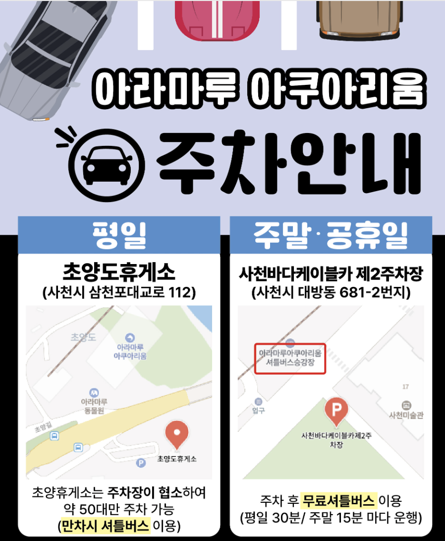 사천 아라마루를 가기 위해서는 네비게이션에 초양도 휴게소를 검색하셔도 됩니다. 초양도 휴게소와 아라마루는 연결이 되어있어요. 그래서 주차시는 초양도 휴게소 주차장에 주차를 하시면 되고 만약 만차시에는 사천바다케이블카 제2주차장에 대면 됩니다. 저희는 평일이어서 그런지 초양도 휴게소에 주차 공간이 넉넉하여 편하게 주차할 수 있었습니다. (주차비는 무료)