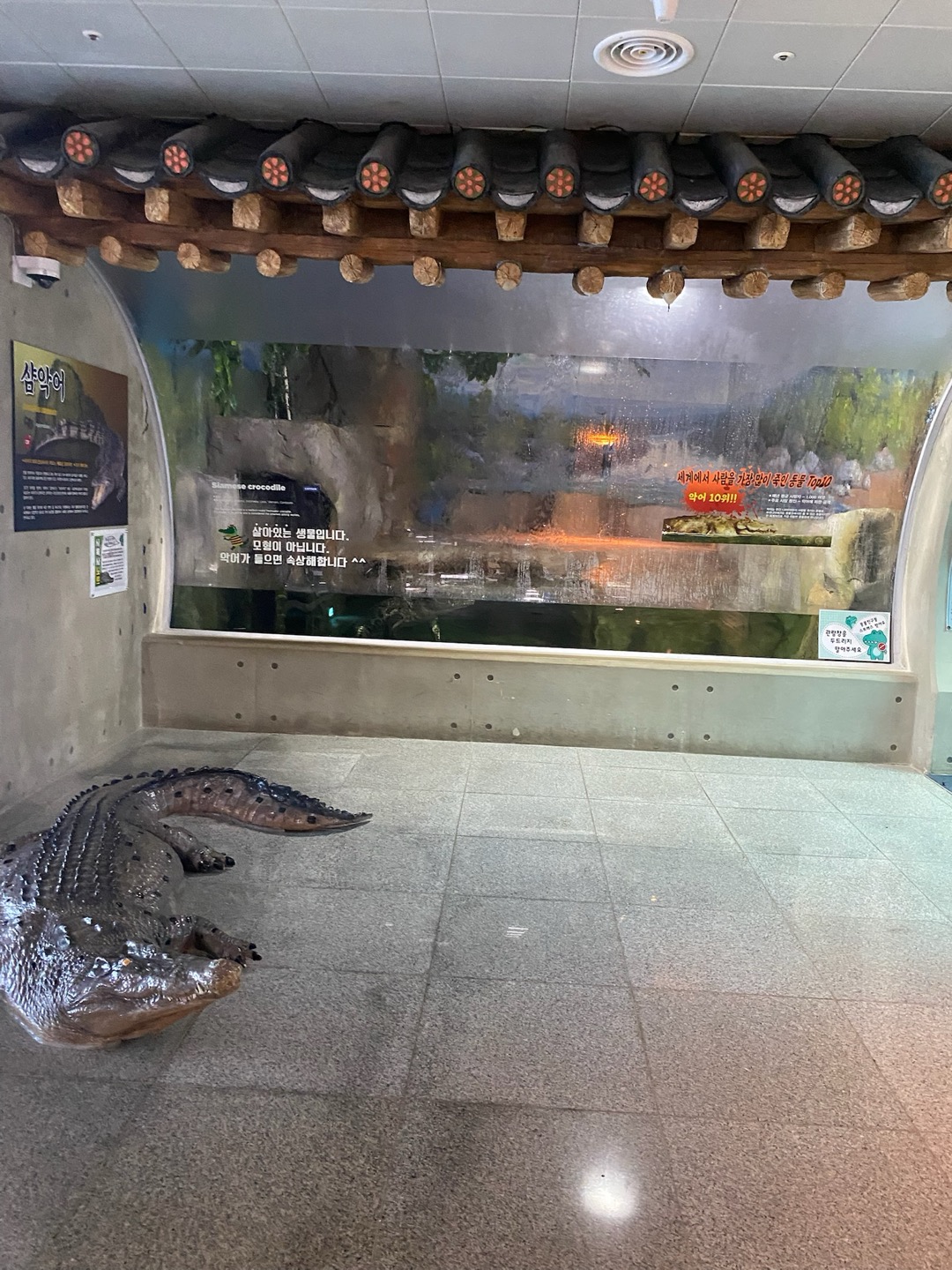 1층에서는 대형 터널수조와 폭포수조, 아마존 강을 재현한 피라루크 수조 등 다양한 수중 생물을 관찰할 수 있습니다. 들어가자마자 악어가 저희를 맞이해주었어요.